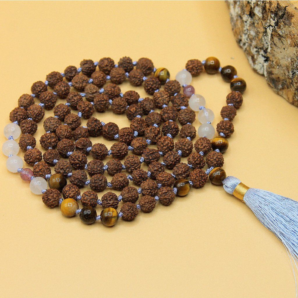 Japa Mala(delší) - měsíční kámen, lepidolit, rudraksha, tygří oko