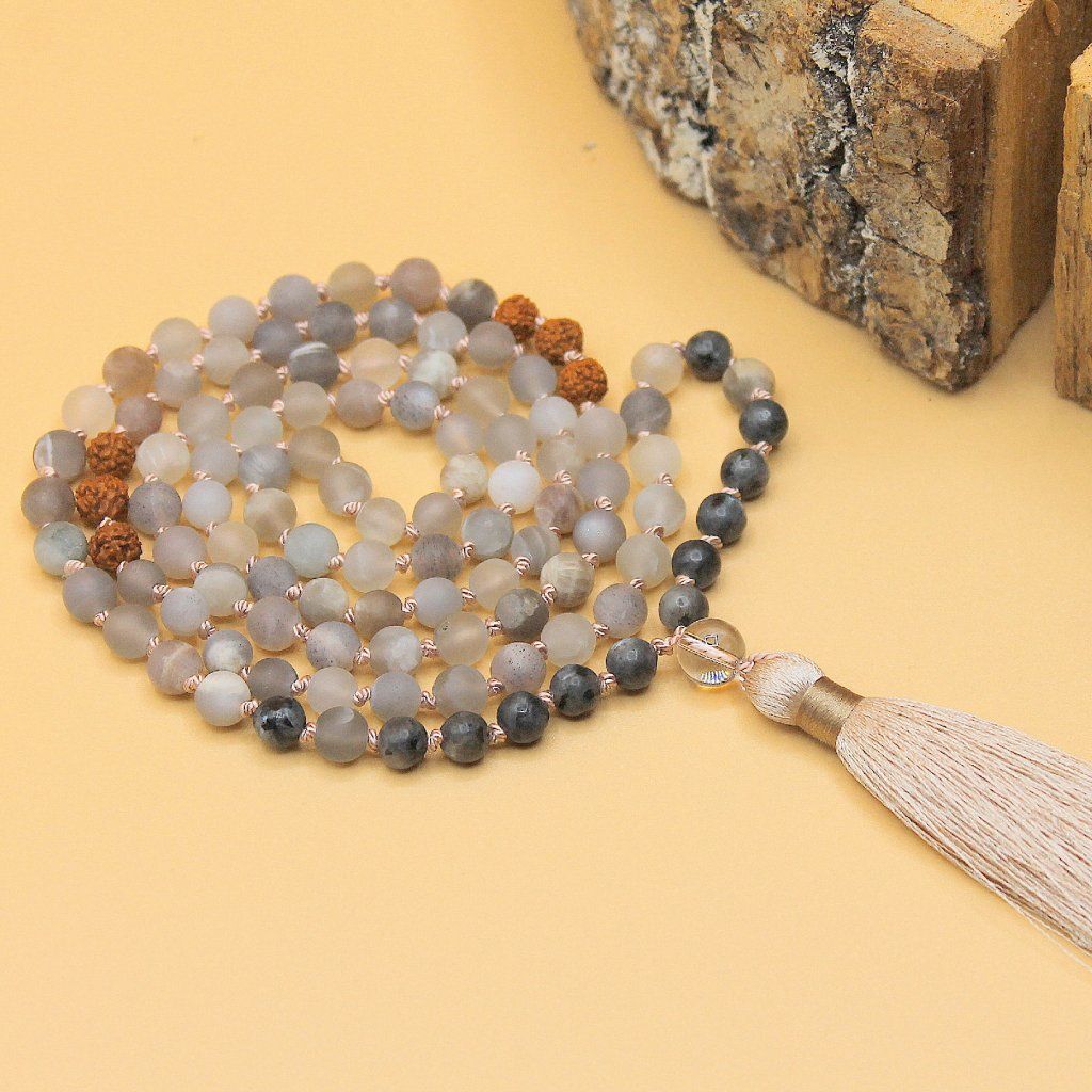 Japa Mala(tradiční) - labradorit, achát, rudraksha, křišťál