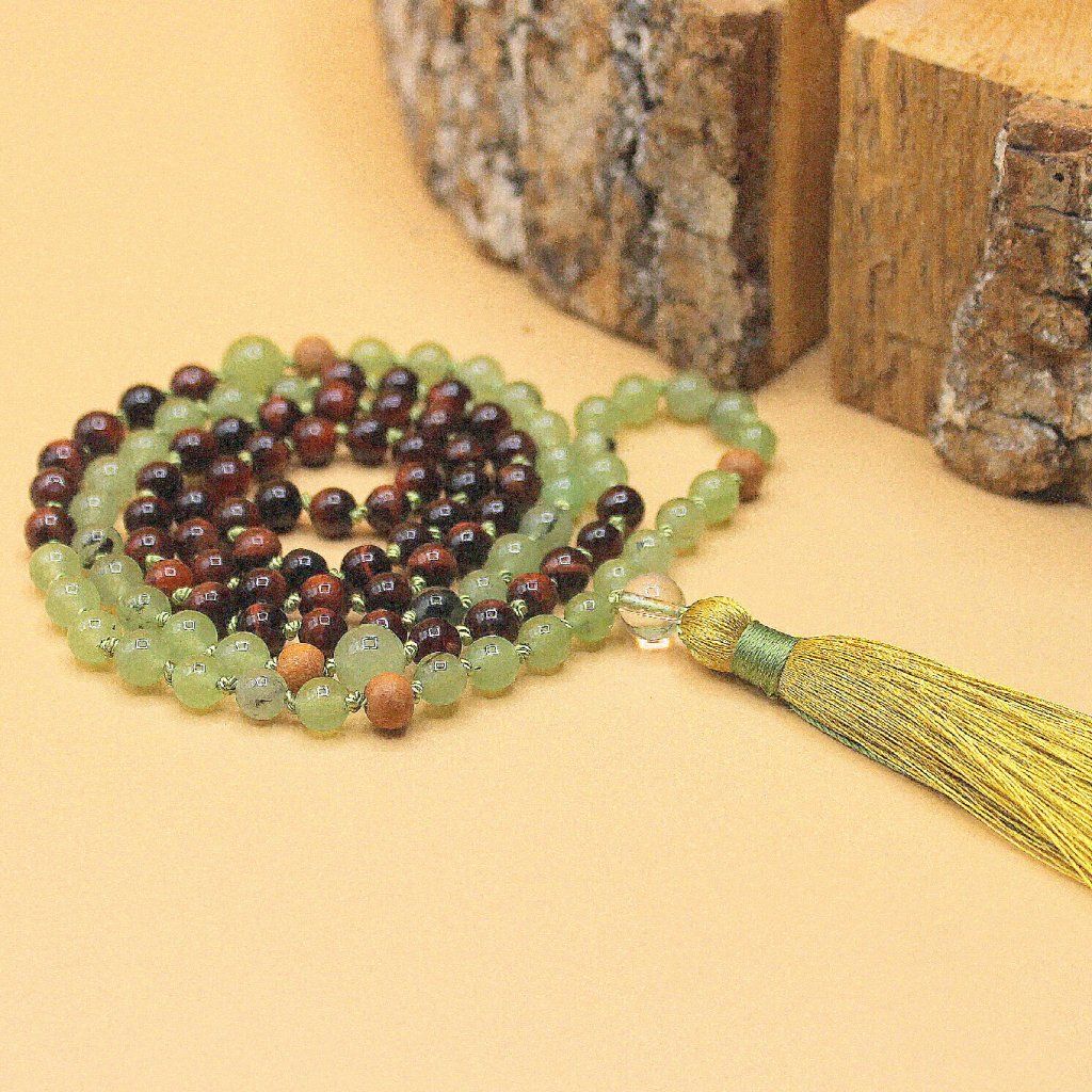 Japa Mala(tradiční) - prehnit, santalové dřevo, červené tygří oko, křišťál