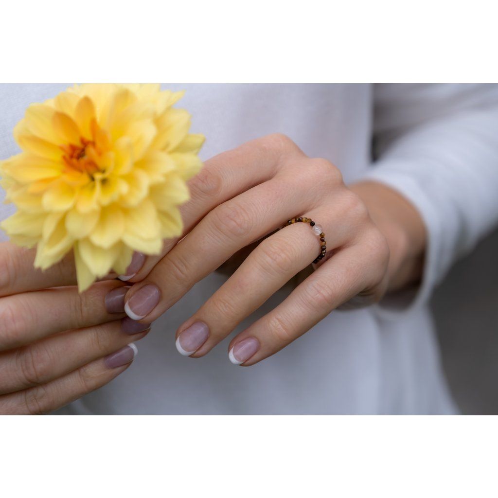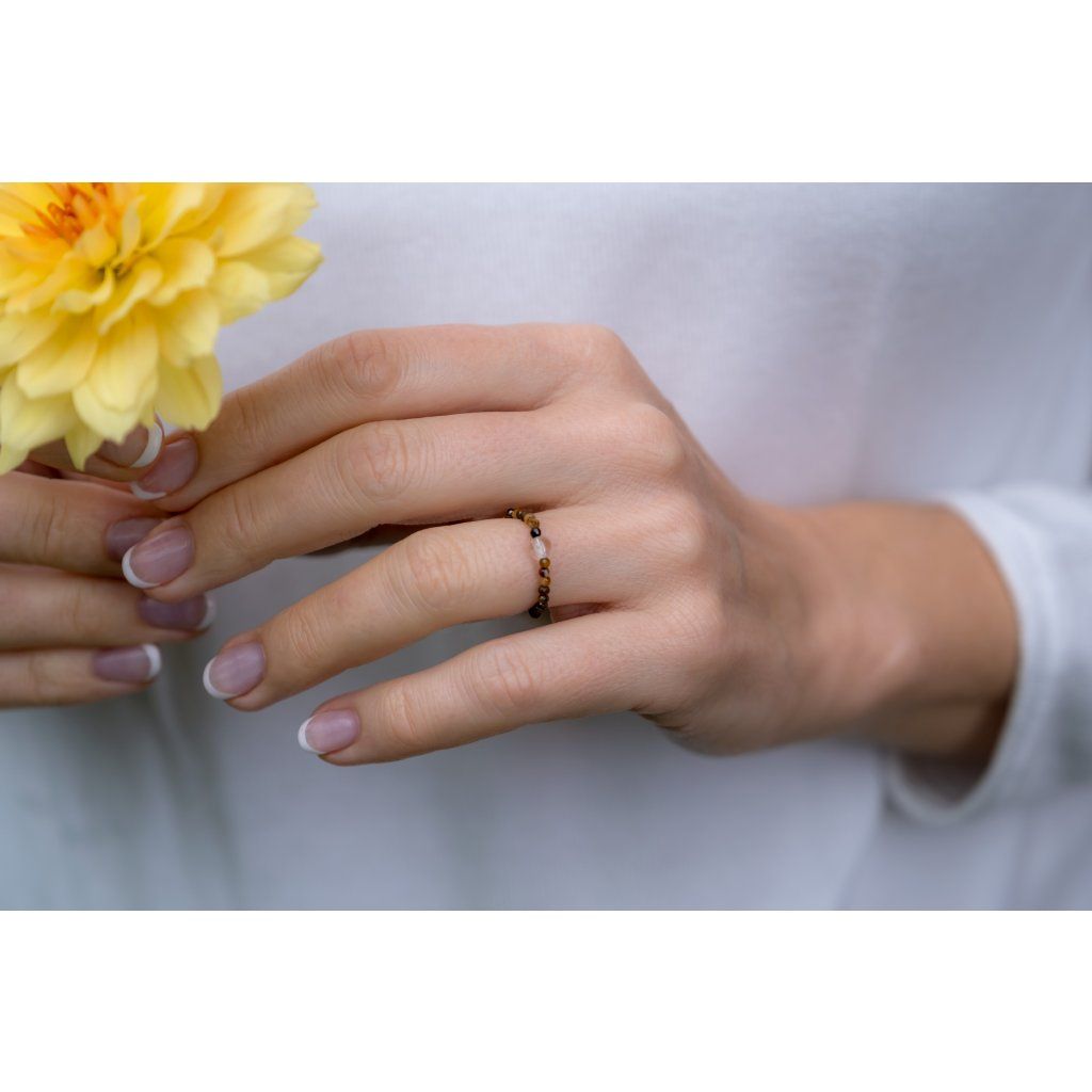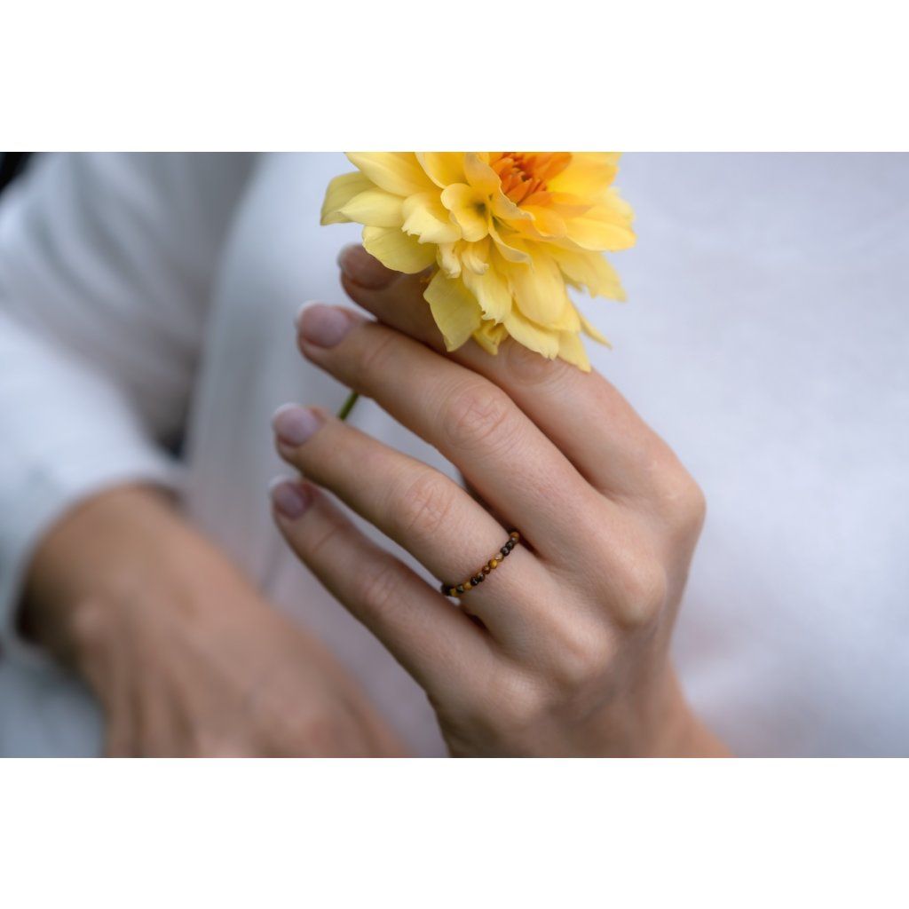 Prstýnek je navlečený na pružném vlákně. Každý korálek je originál, může se proto mírně lišit velikostí a barvou.