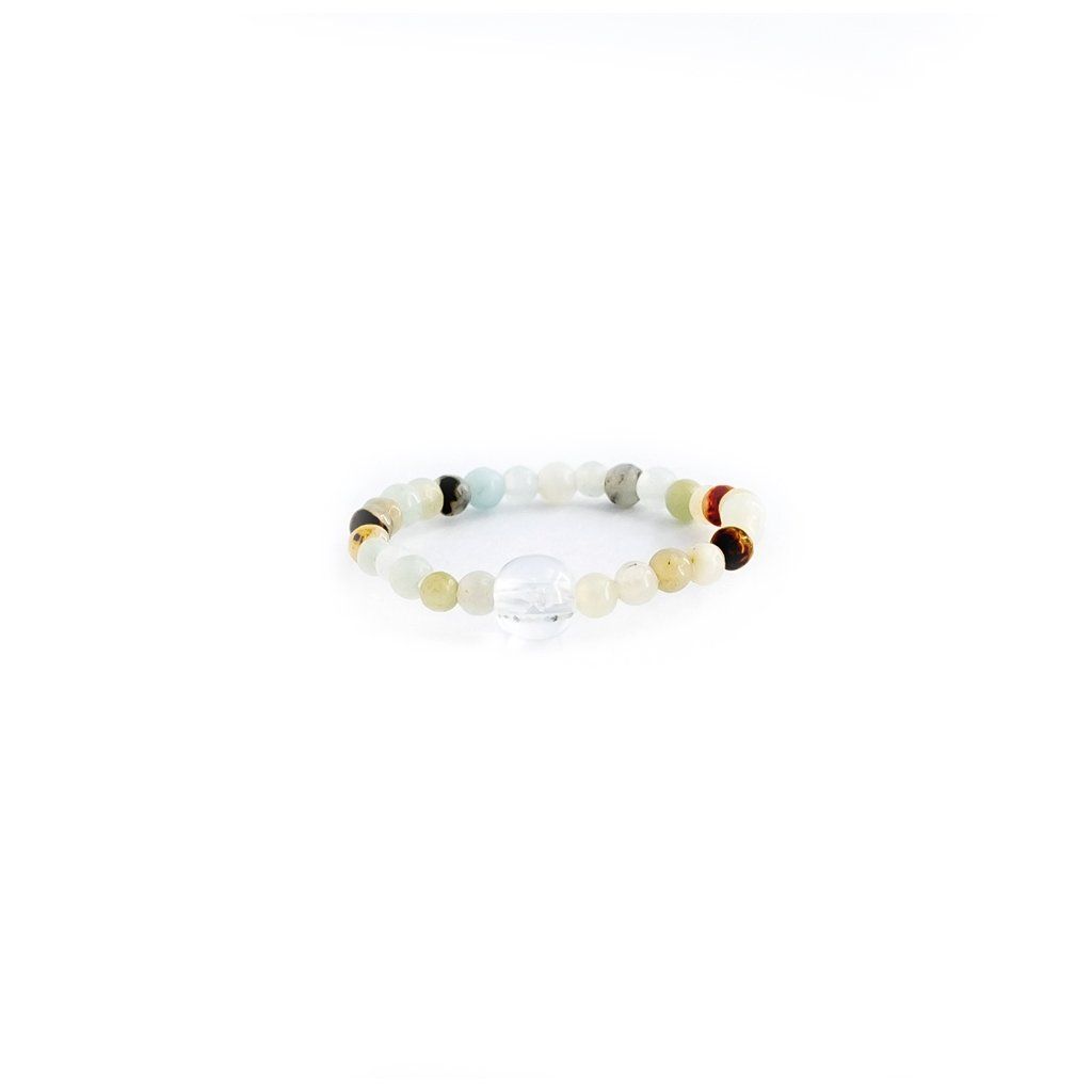 AMAZONIT ~ Amazonit už díky své barevnosti připomínající nekonečný průzračný oceán navozuje pocity klidu, bezpečí a harmonie. Propůjčuje schopnost objevit sebe sama, vyjádřit své skutečné myšlenky a pocity a překonat strach z toho, co ve svém nitru můžeme objevit. Díky němu se budete na věci dívat z nových úhlů pohledu a jakákoliv komunikace bude snazší. Je to ten pravý kámen odvahy a pravdy .KŘIŠŤÁL ~ Čistý křišťál je univerzální pozitivní krystal a silný zesilovač energie ostatních kamenů. Energii umí jak pohltit, tak uvolnit, regulovat a vyrovnávat. Svého nositele ochrání před vším negativním, umí pomoci odstranit psychické bloky a čistit geopatogenní zóny. Nepřijde si na něj ani škodlivé elektromagnetické záření.