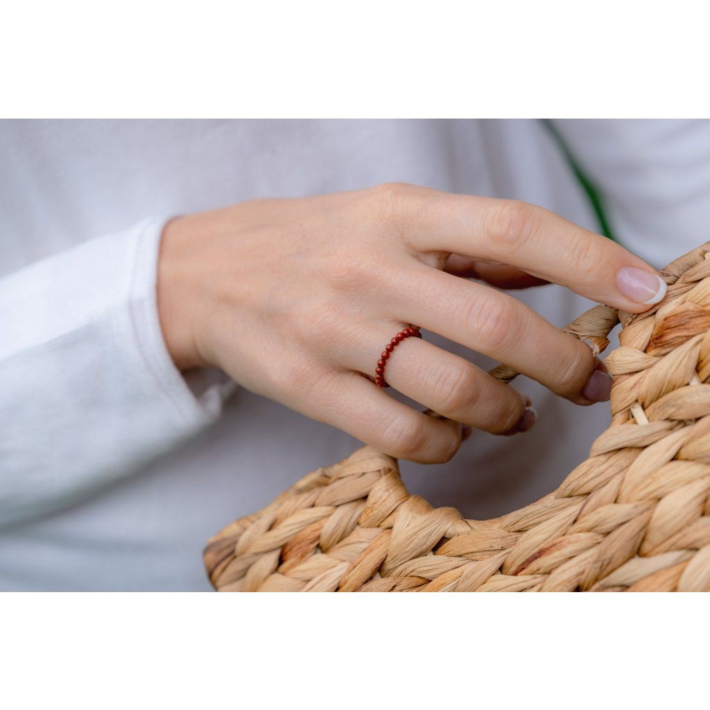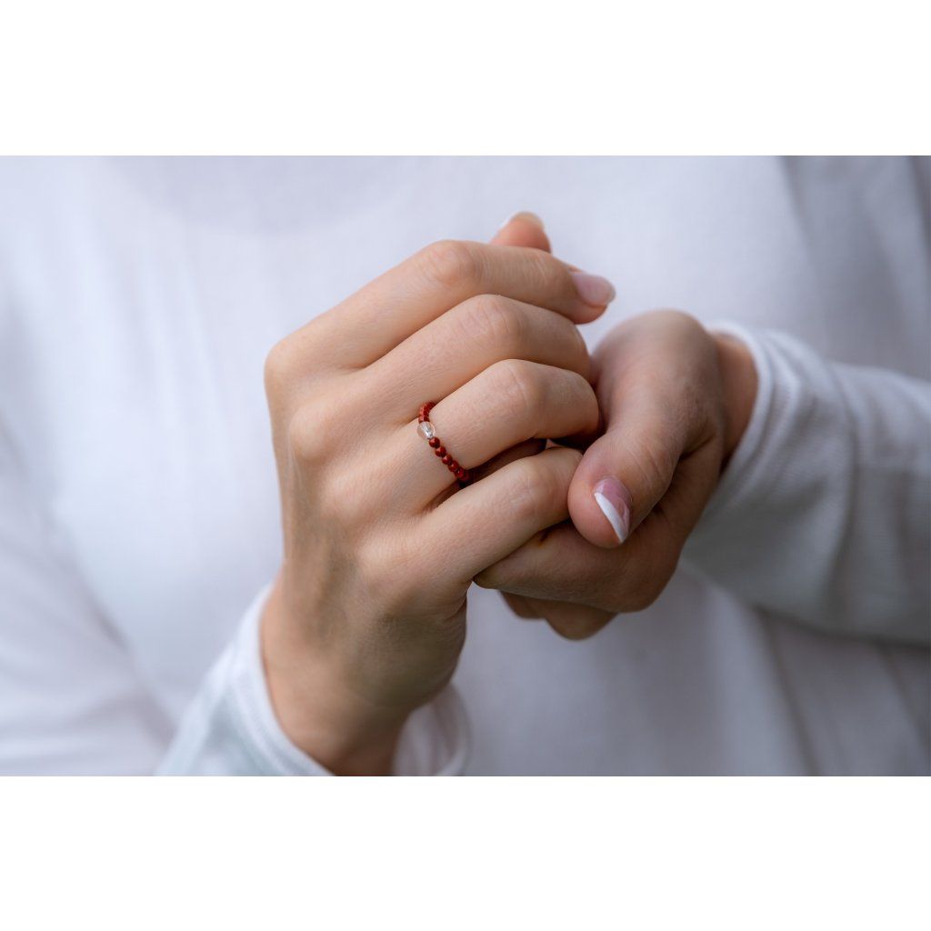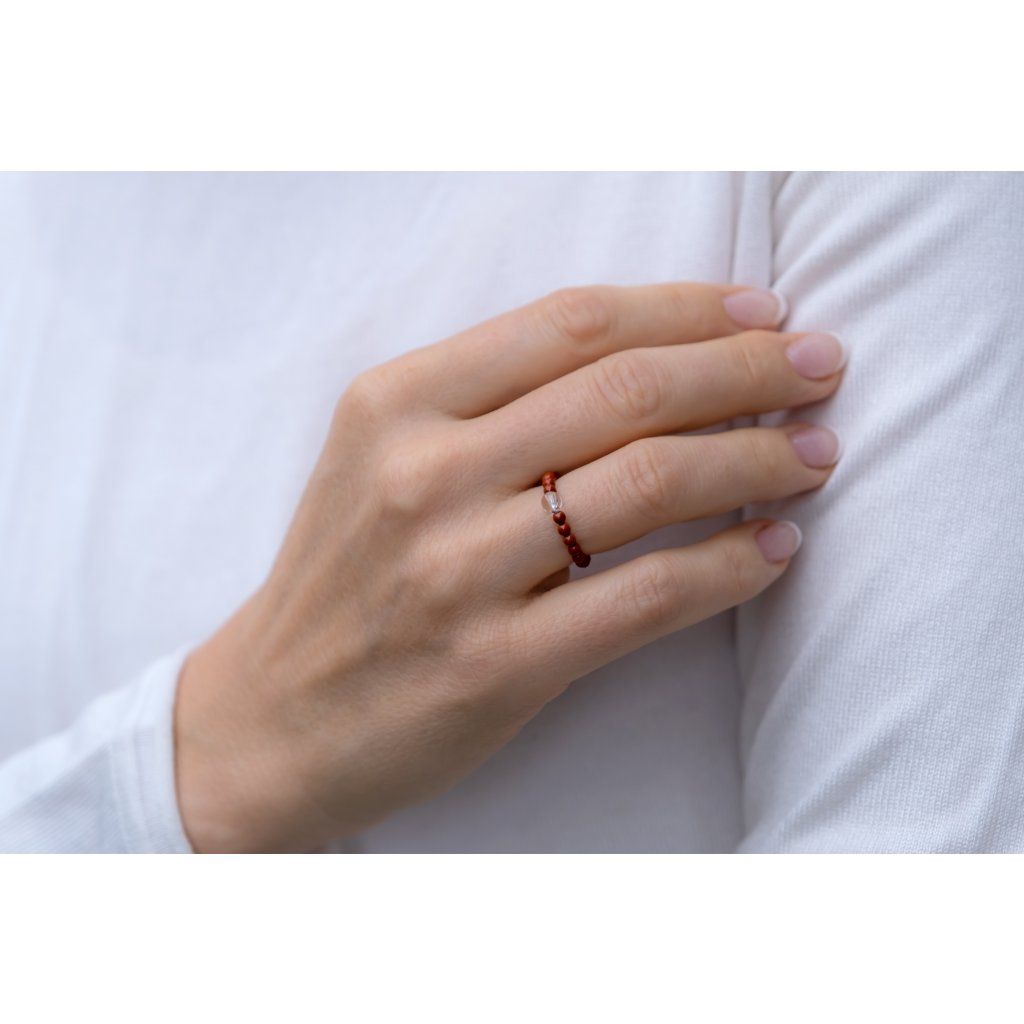 Prstýnek je navlečený na pružném vlákně. Každý korálek je originál, může se proto mírně lišit velikostí a barvou.